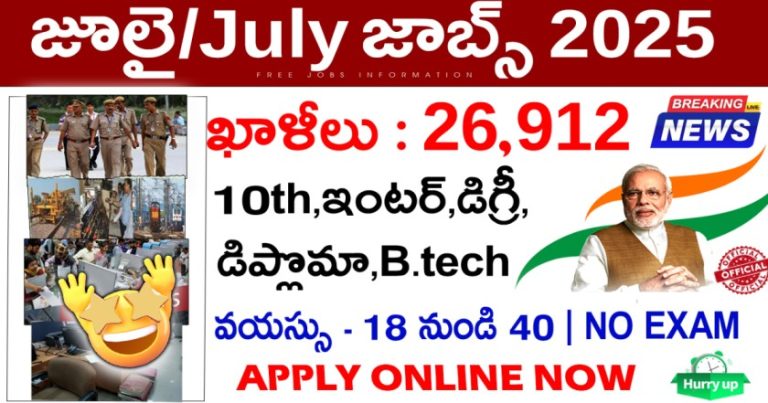 2025 జూలై నెలల్లో టాప్ 8 ప్రభుత్వ ఉద్యోగాలు – వెంటనే అప్లై చేయండి! Top govt jobs in July 2025 : 1.రైల్వే RRB టెక్నీషియన్ పోస్టులు – 6400 ఖాళీలు సంస్థ: రైల్వే రిక్రూట్మెంట్ బోర్డ్స్ (RRBs) పోస్టు పేరు: టెక్నీషియన్ (గ్రేడ్ 1 సిగ్నల్ & గ్రేడ్ 3) మొత్తం ఖాళీలు: 6400 దరఖాస్తు తేదీలు: 2025 జూన్ 28 నుండి జూలై 17 వరకు CBT 1 పరీక్ష తేదీ: 2025 … Read more