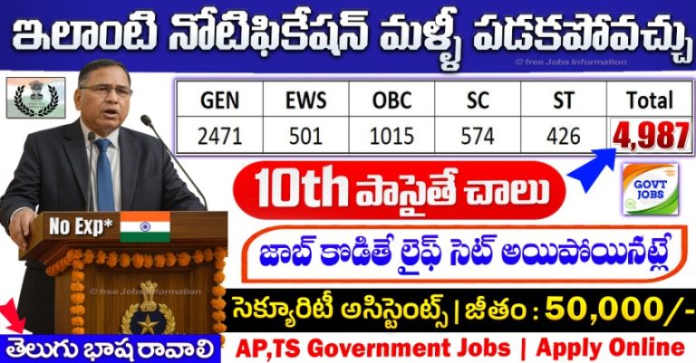 IB Security Assistant Recruitment 2025 :ఇంటెలిజెన్స్ బ్యూరో (IB) నుంచి 2025లో భారీ ఉద్యోగ నోటిఫికేషన్ విడుదలైంది. దేశ భద్రతలో కీలకపాత్ర పోషించే ఈ కేంద్ర ప్రభుత్వ సంస్థ నుండి Security Assistant/Executive (SA/Exe) పోస్టుల భర్తీకి సంబంధించి మొత్తం 4987 ఖాళీలు ప్రకటించబడ్డాయి. పదో తరగతి పాస్ అయిన అభ్యర్థులకు ఇది ఓ సూపర్ అవకాశం. కేంద్ర హోంశాఖ ఆధ్వర్యంలోని ఈ ఉద్యోగాలు గ్రూప్ ‘C’, నాన్-గెజిటెడ్, నాన్-మినిస్టీరియల్ కేటగిరీలోకి వస్తాయి. ముఖ్యమైన తేదీలు: … Read more
