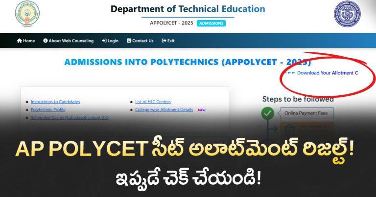 AP POLYCET సీట్ అలాట్‌మెంట్ రిజల్ట్ 2025 వచ్చిందా? ఎలా చూడాలి? తర్వాతి దశలు ఏంటి? AP POLYCET Seat Allotment 2025 : ఆంధ్రప్రదేశ్ రాష్ట్రంలో పాలిటెక్నిక్ కోర్సుల్లో అడ్మిషన్ కోసం ప్రతి సంవత్సరం నిర్వహించే ఎంట్రన్స్ పరీక్షే AP POLYCET. 2025 సంవత్సరం కోసం పరీక్ష కూడా పూర్తయ్యింది, ఫలితాలు కూడా వచ్చాయి. ఇప్పుడు విద్యార్థులు ఎదురుచూస్తున్నది ఒక్కటే – సీట్ అలాట్‌మెంట్ రిజల్ట్. ముందుగా వెల్లడించిన షెడ్యూల్ ప్రకారం, ఈ సీట్ అలాట్‌మెంట్ … Read more